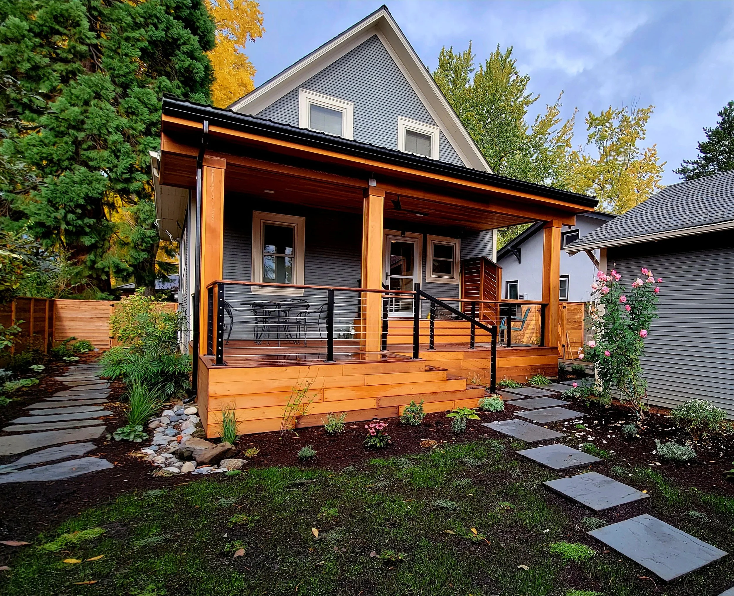 This early 1900’s craftsman home in North Portland received a full-property makeover for year-round enjoyment. To accommodate the homeowners in the Pacific Northwest’s four seasons, Habitat Gardens designed two covered structures.